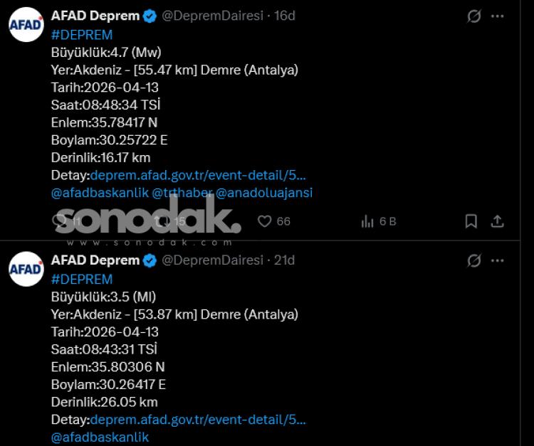 AFAD, Antalya’nın Demre ilçesi açıklarında kısa aralıklarla 3,5 ve 4,7 büyüklüğünde iki zelzele meydana geldiğini duyurdu.