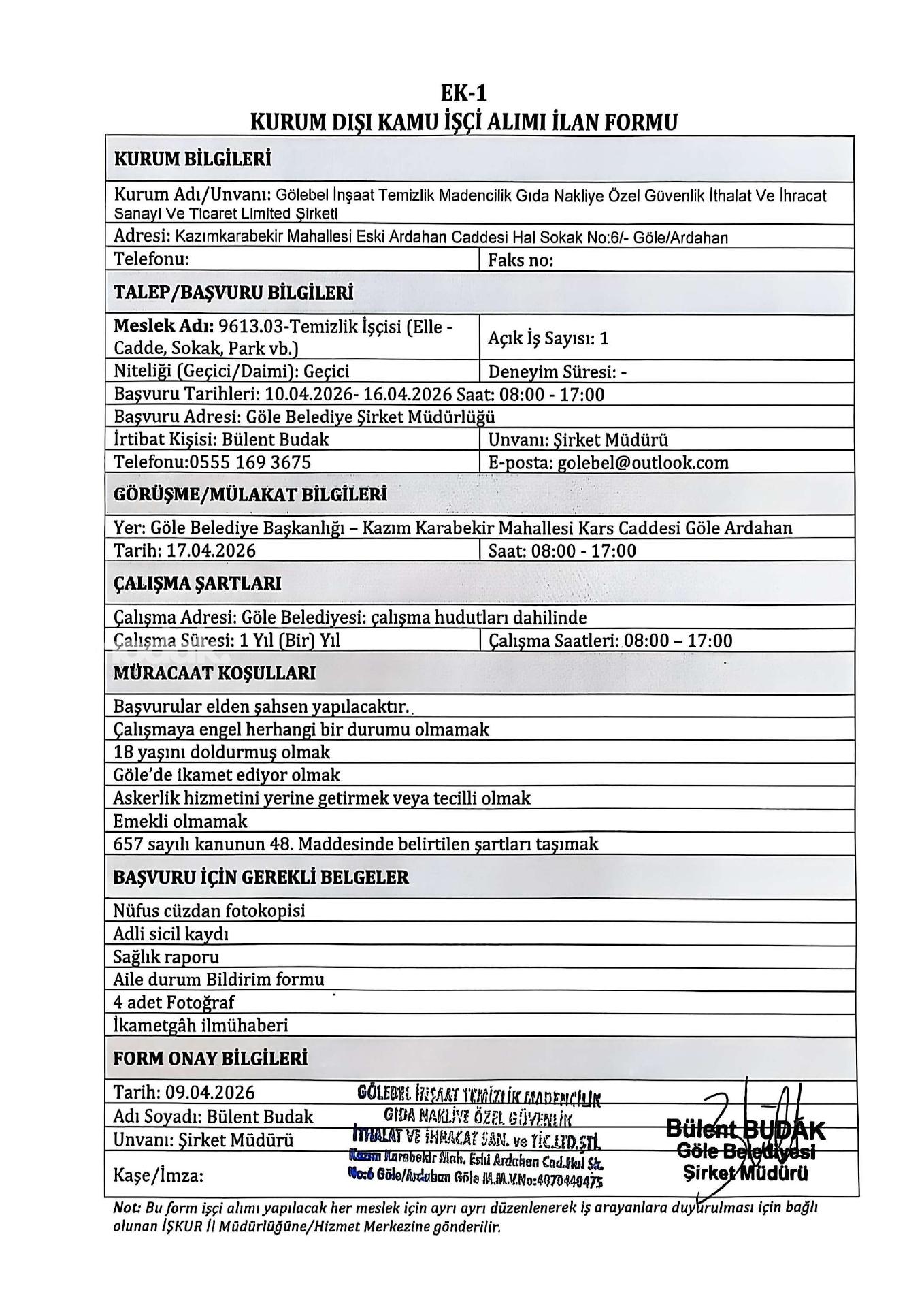 Ardahan Gölebel İnşaat Süreksiz 1 Emekçi Alacak. Son müracaat tarihi 16 Nisan 2026