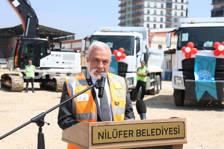 Araç filosuna yeni katılan 4 iş makinesi ve 6 kamyonun hizmete giriş töreni Nilüfer Belediye Başkanı Şadi Özdemir, başkan yardımcıları ve çalışanın iştirakiyle gerçekleştirildi.