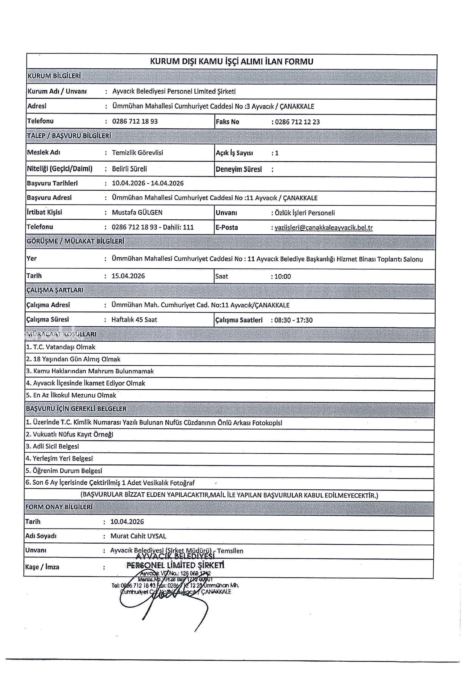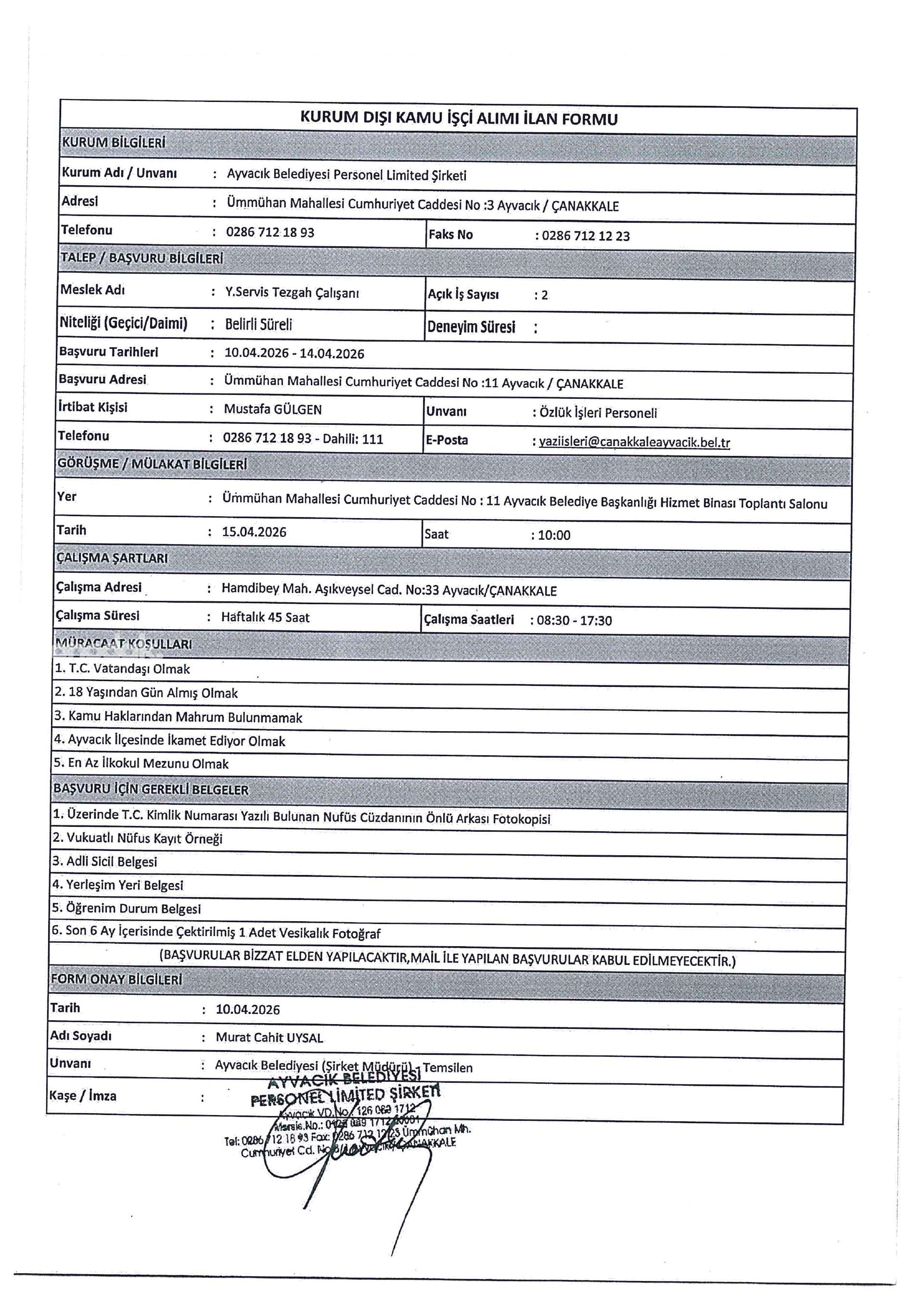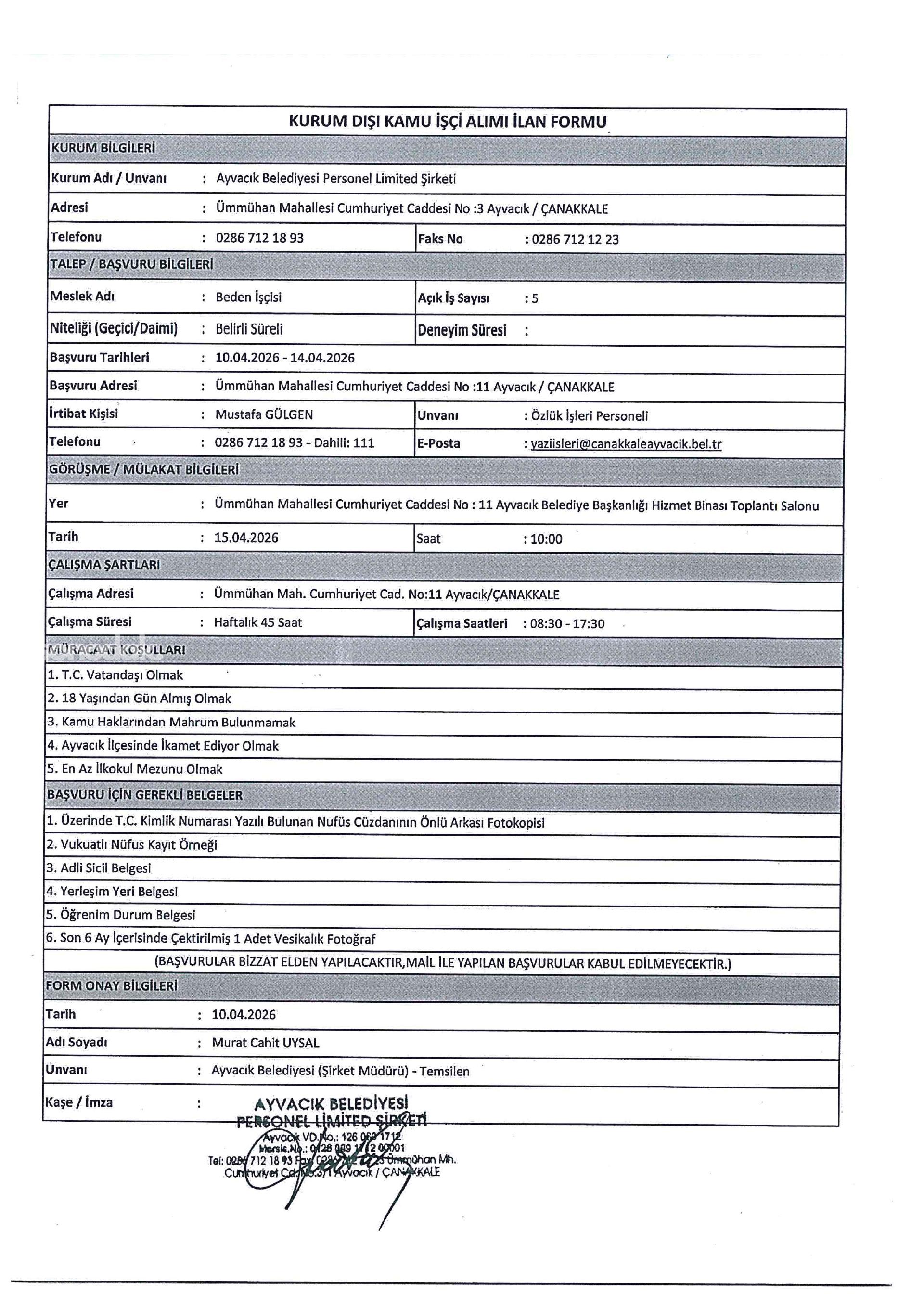 Çanakkale Ayvacık Belediyesi 10 İşçi Alacak. Son başvuru tarihi 14 Nisan 2026