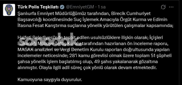 ANKARA (İGFA) – Şanlıurfa’da Halfeti Belediyesi’ne yönelik yürütülen soruşturma kapsamında geniş çaplı bir operasyon gerçekleştirildi.