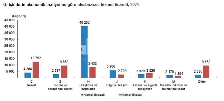 İthalat tarafında ise toplam 48,4 milyar dolarlık hizmet ithalatının en büyük kısmı 12,7 milyar dolarla imalat sanayinden kaynaklandı. Toptan ve perakende ticaret 9,6 milyar dolar, finans ve sigorta bölümü 3,8 milyar dolar, bilgi ve bağlantı dalı ise 2,7 milyar dolar hizmet ithalatı gerçekleştirdi.