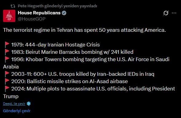 ABD ise İran’ın 50 yıldır Amerika’ya saldırdığını iddia ederek saldırıları meşrulaştırmaya çalıştı. ABD Cumhuriyetçiler Meclis Üyesi Lisa McClain  “Tahran’daki terörist rejim 50 yıldır Amerika’ya saldırıyor” diyerek saldırıları haklı çıkarmaya çalıştı.