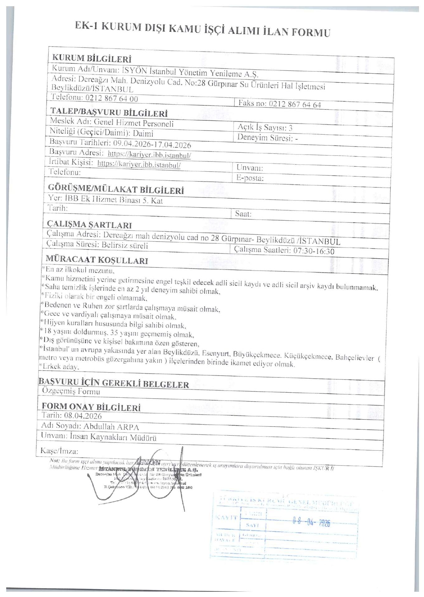İstanbul İsyön 3 Emekçi Alacak. Son müracaat tarihi 17 Nisan 2026