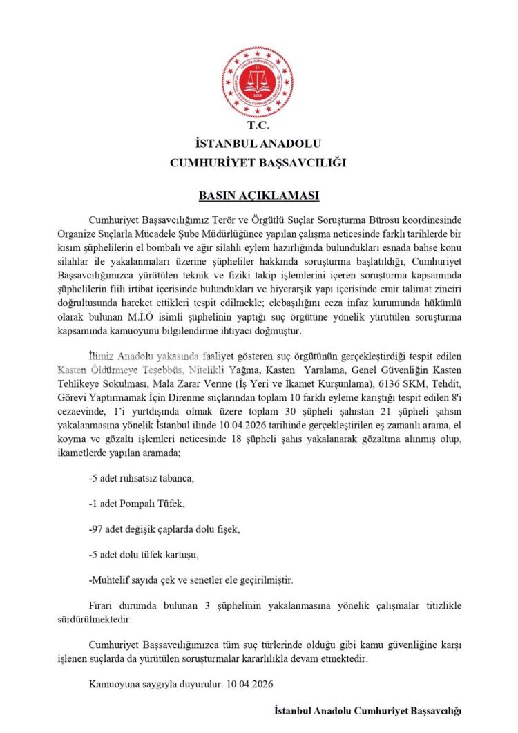 İSTANBUL (İGFA) – İstanbul Anadolu Cumhuriyet Başsavcılığı, Terör ve Örgütlü Kabahatler Soruşturma Ofisi koordinesinde yürütülen çalışma kapsamında, silahlı bir kabahat örgütüne yönelik geniş çaplı operasyon gerçekleştirildiğini açıkladı.