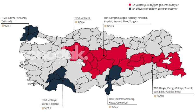 En düşük artış ise yüzde 21,1 ile TR21 (Edirne, Kırklareli, Tekirdağ) bölgesinde kaydedildi.
