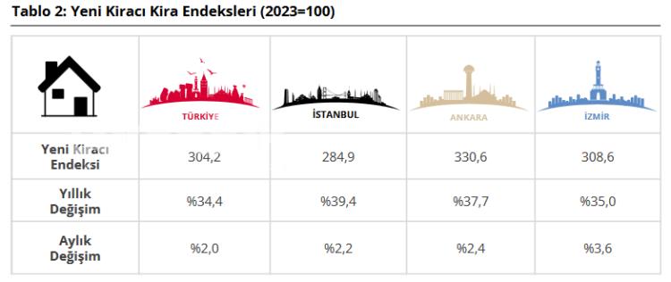 Büyükşehirlerde kira artışları İstanbul’da yüzde 39,4, Ankara’da yüzde 37,7 ve İzmir’de yüzde 35 düzeyinde gerçekleşti. Bölgesel olarak en yüksek kira artışı yüzde 40,5 ile Doğu Anadolu’daki TRB2 (Erzurum, Erzincan, Bayburt, Ağrı, Ardahan, Kars, Iğdır) bölgesinde görülürken, en düşük artış yüzde 25,7 ile TR63 (Hatay, Kahramanmaraş, Osmaniye) bölgesinde kaydedildi.