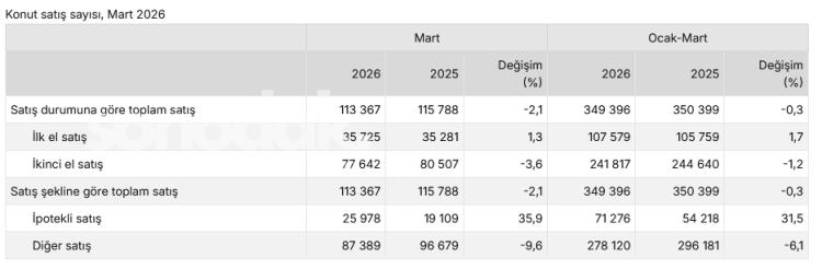 Mart ayında birinci el konut satışları geçen yılın tıpkı ayına nazaran yüzde 1,3 artarak 35 bin 725’e yükseldi. Buna karşılık ikinci el konut satışları yüzde 3,6 azalarak 77 bin 642 olarak kaydedildi. Toplam satışlar içinde birinci el konutların hissesi yüzde 31,5 olurken, ikinci el satışların hissesi yüzde 68,5 düzeyinde gerçekleşti.