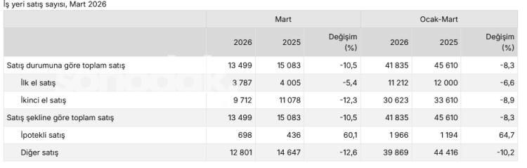 İş yeri satışlarında da benzeri bir tablo ortaya çıktı. Birinci el iş yeri satışları yüzde 5,4 azalarak 3 bin 787’ye, ikinci el satışlar ise yüzde 12,3 düşüşle 9 bin 712’ye geriledi. Buna rağmen ipotekli iş yeri satışları yüzde 60,1 artarak 698’e yükselirken, öteki satışlar yüzde 12,6 azalarak 12 bin 801 oldu.