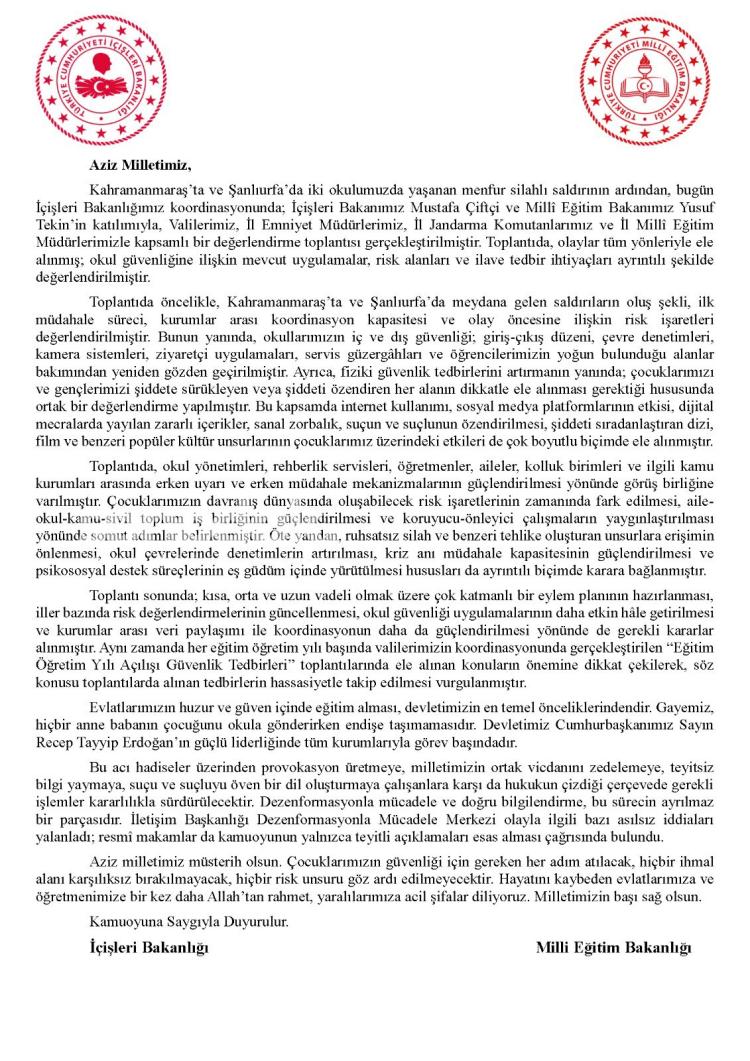 ANKARA (İGFA) – Kahramanmaraş ve Şanlıurfa’da yaşanan okul akınlarının akabinde, güvenlik tedbirlerinin artırılması gayesiyle kapsamlı bir kıymetlendirme toplantısı gerçekleştirildi.