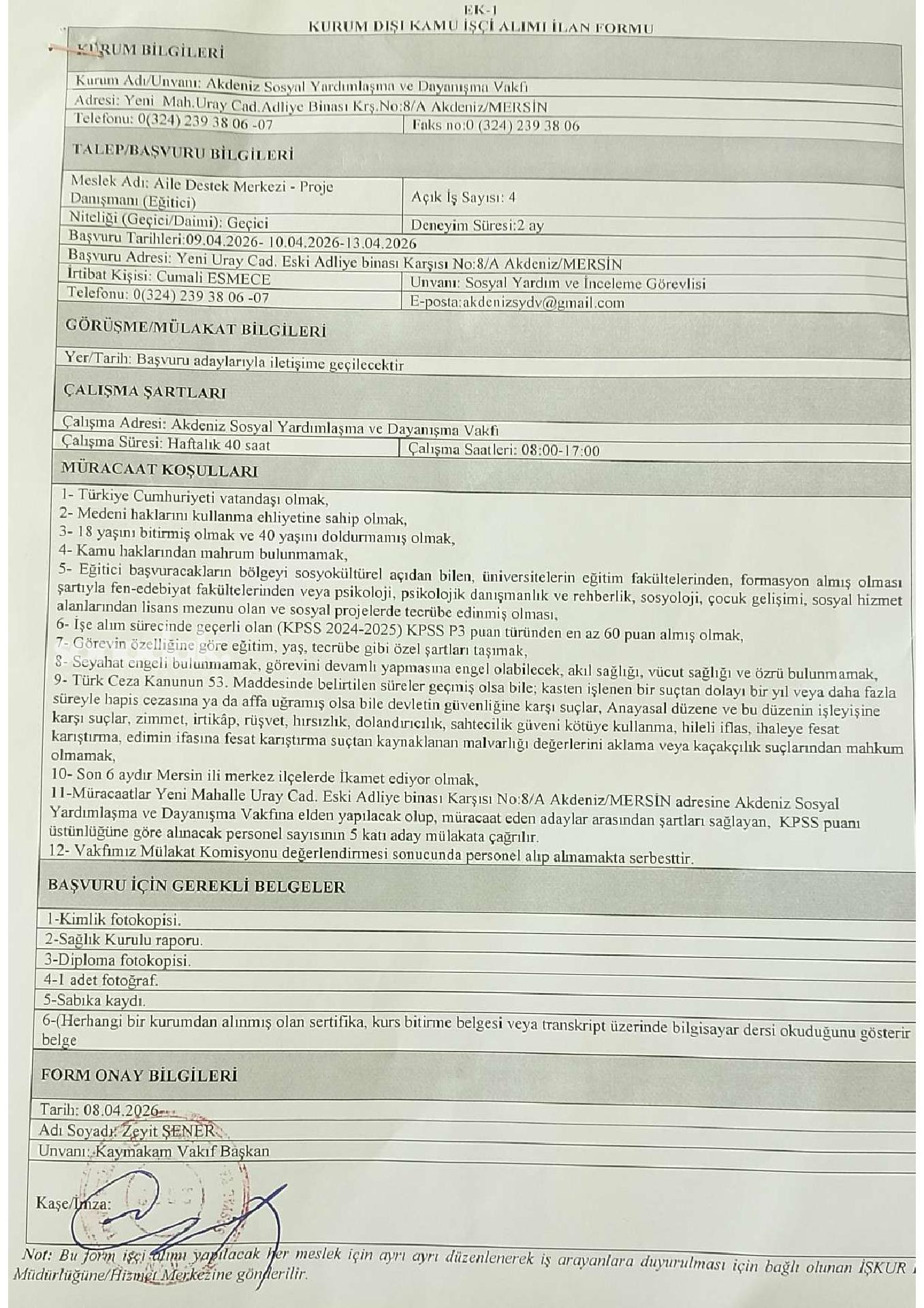 Mersin Akdeniz SYDV Süreksiz 4 Personel Alacak. Son müracaat tarihi 13 Nisan 2026
