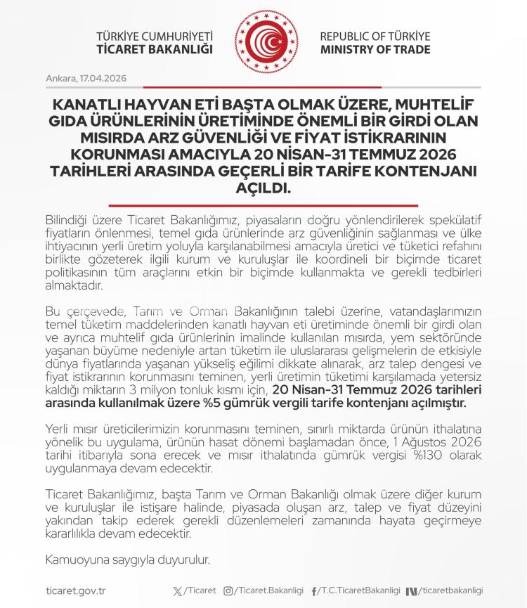 Açıklamada ayrıyeten, yerli üreticinin korunmasına da dikkat çekilerek, hasat devrinin başlamasıyla birlikte uygulamanın 1 Ağustos 2026 prestijiyle sona ereceği ve bu tarihten sonra mısır ithalatında gümrük vergisinin tekrar yüzde 130 olarak uygulanacağı bildirildi.