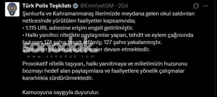 Emniyet Genel Müdürlüğü tarafından yapılan açıklamaya nazaran, olaylarla irtibatlı olarak dijital platformlarda yayılan içeriklere yönelik incelemelerde 1.115 URL adresine erişim mahzuru getirildi.
