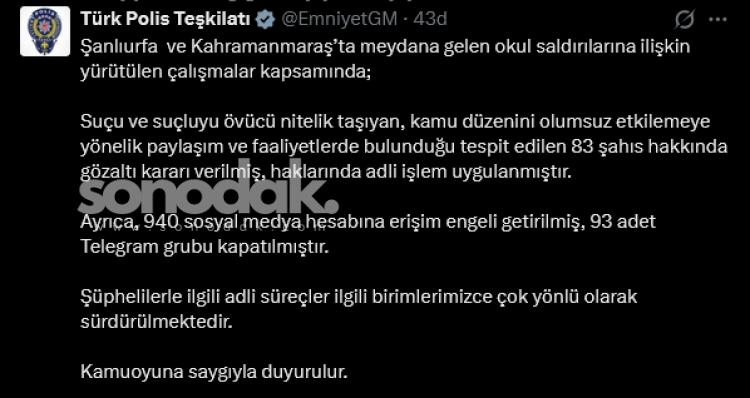 Yapılan incelemelerde, toplumsal medya üzerinden kabahati ve hatalıyı öven, kamu sistemini olumsuz etkileyebilecek içerikler paylaştığı belirlenen 83 kişi hakkında gözaltı kararı verildi ve isimli süreç başlatıldı.