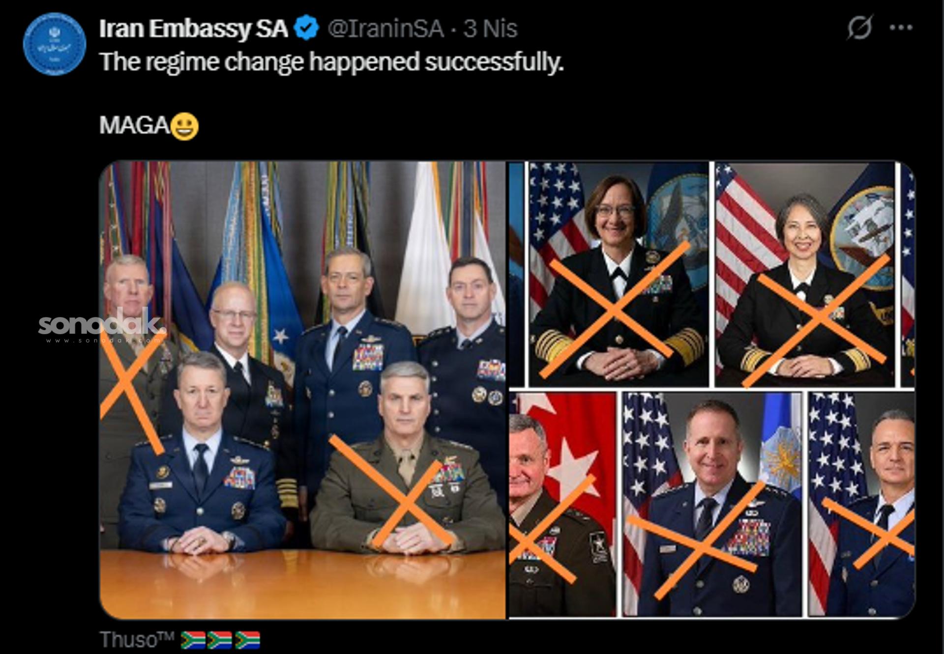 Amerikan basını da Tahran’ın Güney Afrika’daki büyükelçiliği, sosyal medyada görevden alınan ABD’li üst düzey askeri yetkililerin fotoğraflarını paylaşarak ‘rejim değişikliği’ mesajı verdiğini aktardı.