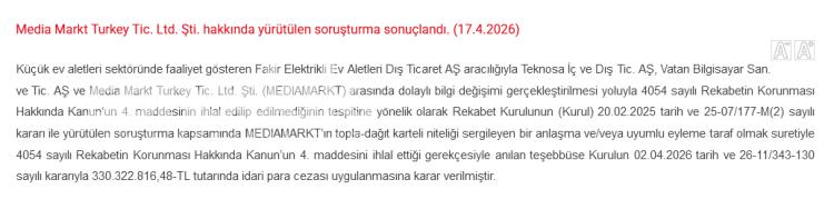 Kurulun 2 Nisan 2026 tarihli kararı doğrultusunda MediaMarkt’a 330 milyon 322 bin 816 TL meblağında idari para cezası uygulanmasına karar verildi.