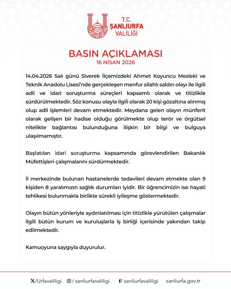 ŞANLIURFA (İGFA) – Şanlıurfa’nın Siverek ilçesinde bulunan Ahmet Koyuncu Mesleksel ve Teknik Anadolu Lisesi’nde 14 Nisan 2026’da meydana gelen silahlı hücuma ait soruşturma çok taraflı olarak sürdürülüyor.