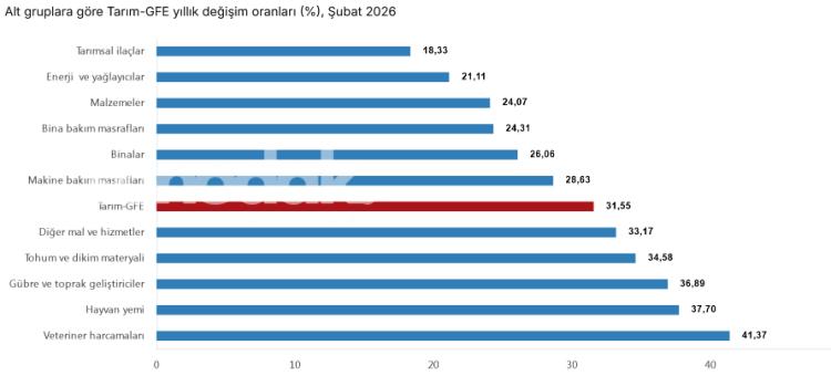 Ana harcama kümelerinde aylık bazda tarımda kullanılan mal ve hizmetler endeksi yüzde 2,96, ziraî yatırıma katkı sağlayan mal ve hizmetler endeksi ise yüzde 3,94 artış gösterdi. Yıllık bazda ise tarımda kullanılan mal ve hizmetlerde yüzde 32,81, ziraî yatırıma katkı sağlayan kalemlerde yüzde 24,31 artış kaydedildi.