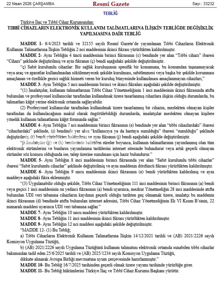 ANKARA (İGFA) – Türkiye İlaç ve Tıbbî Cihaz Kurumu tarafından hazırlanan “Tıbbi Aygıtların Elektronik Kullanım Talimatlarına Ait Bildiride Değişiklik Yapılmasına Dair Tebliğ”, bugünkü Resmi Gazete’de yayımlanarak yürürlüğe girdi.