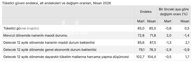 ANKARA (İGFA) – Türkiye İstatistik Kurumu (TÜİK) ile Türkiye Cumhuriyet Merkez Bankası (TCMB) tarafından yürütülen tüketici eğilim anketine nazaran, tüketici inanç endeksi Nisan ayında hudutlu bir artış kaydetti. Mart ayında 85,0 olan endeks, yüzde 0,5 yükselerek 85,5 düzeyine ulaştı.