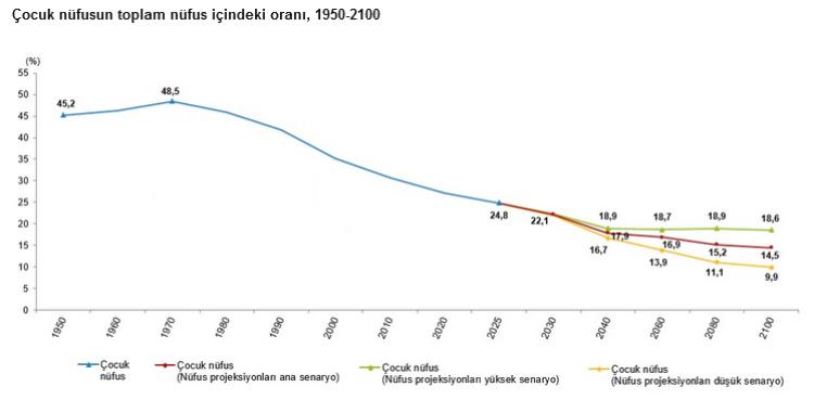 Uzun yıllara yayılan bilgilere nazaran çocuk nüfus oranındaki düşüş dikkat çekti. 1970’te yüzde 48,5 olan oran, 1990’da yüzde 41,8’e, 2025’te ise yüzde 24,8’e geriledi. Nüfus projeksiyonlarına nazaran bu oranın 2100 yılına kadar yüzde 14-18 bandına kadar düşmesi öngörülüyor.