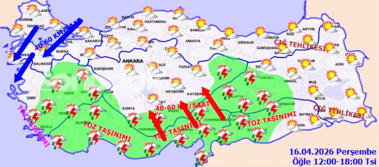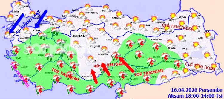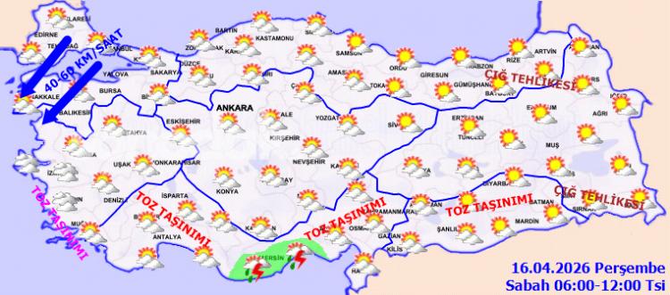 Yapılan son değerlendirmelere nazaran; Kuzey Afrika kaynaklı toz taşınımının, Kıyı Ege ile Akdeniz kıyılarında 16.04.2026 Perşembe günü gece saatlerine kadar yer yer tesirli olması beklendiğinden hava kalitesinde azalma, görüş arasında düşüş ve ulaşımda aksamalar üzere aksiliklere karşı dikkatli ve önlemli olunması gerekmektedir.
