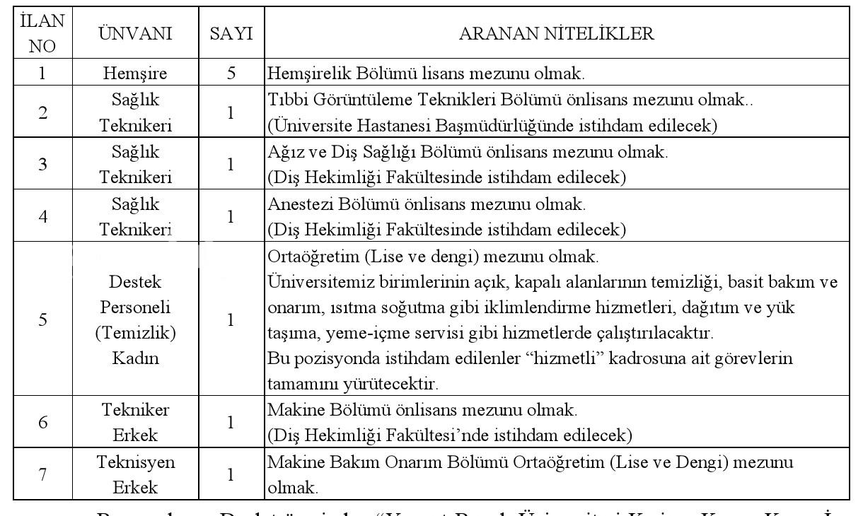 Üniversitemizde Rektörlükçe görevlendirilecek ünitelerde, 2024 Yılı KPSS (B grubu) puan sıralaması temel alınarak, 657 sayılı Kanun’un 4/B unsuru ile 06/06/1978 tarihli ve 7/15754 sayılı BKK ile yürürlüğe konulan Kontratlı İşçi Çalıştırılmasına Ait Temeller yeterince, gündüz yahut gece nöbet sistemine nazaran çalıştırılacak kontratlı işçi alınacaktır.