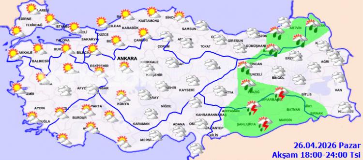 BURSA (İGFA) – Meteoroloji Genel Müdürlüğüİ 26 Nisan Pazar gününe ait hava kestirim raporunu yayımladı.